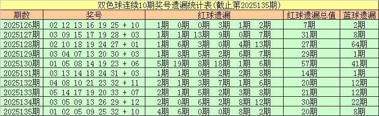 截止双色球第2025135期,最近10期红球遗漏总值分别为:7期、31期、27期、29期、57期、14期、20期、21期、30期、20期,上期遗漏总期数相对较低。