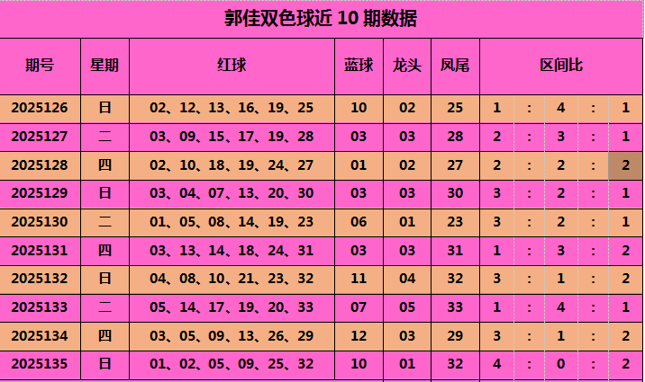 上期回顾:上期开出奖号红球01、02、05、09、25、32,蓝球10,当期红球号龙头01,凤尾32,区间比4:0:2。