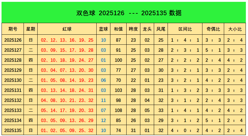 上期回顾:双色球第2025135期开出奖号:红球01、02、05、09、25、32;蓝球10,其中红球三区比为4:0:2,奇偶比4:2,大小比为2:4,蓝球开出1路号码10。