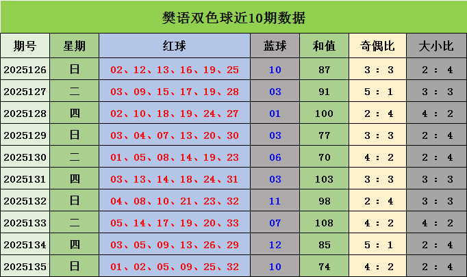 樊语双色球第2025135期奖号为:01 02 05 09 25 32+10。本期红球号码奇偶比为4:2,大小比2:4。