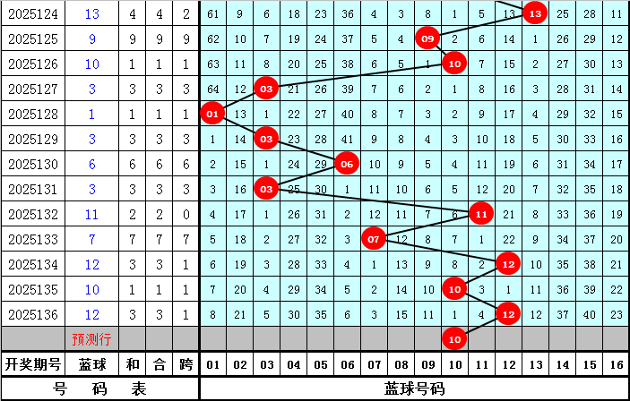 蓝球第137期历史同期开出号码为:12→09→03→09→01→06→13→07→10→09→12→14→03→09→06→01→01→11→12。
