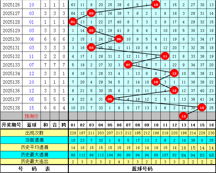 蓝球分析:上期蓝球开出号码15,上升10个点位,最近10期蓝球号码升平降分别为:升、升、降、升、降、升、降、升、降、升,本期看好蓝球下降,独蓝参考13。