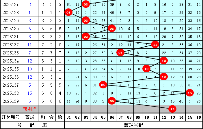 蓝球分析:上期开出蓝球号码06,蓝球遗漏值为41,温冷蓝球近期开出比例较高,本期防冷码蓝球继续解冻,参考蓝球号码13。