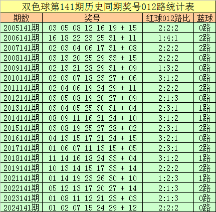 福彩双色球第2025141期历史同期王守礼012路奖号遗漏分析: