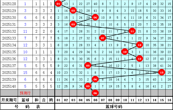 蓝球分析:去年第141期蓝球奖号为12,开出0路蓝球,目前0路蓝球连续出现2年,今年同期预计0路蓝球继续开出,关注号码06。