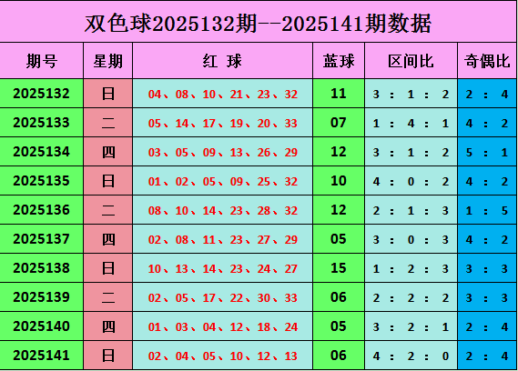 双色球第2025141期开奖:本期开奖号:02 04 05 10 12 13。蓝球:06,奇偶比为2:4。