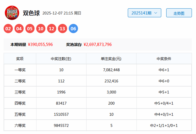 开奖回顾:第2025141期双色球奖号为02、04、05、10、12、13+06。区间比:4:2:0,奇偶比:2:4,首尾间距:11。