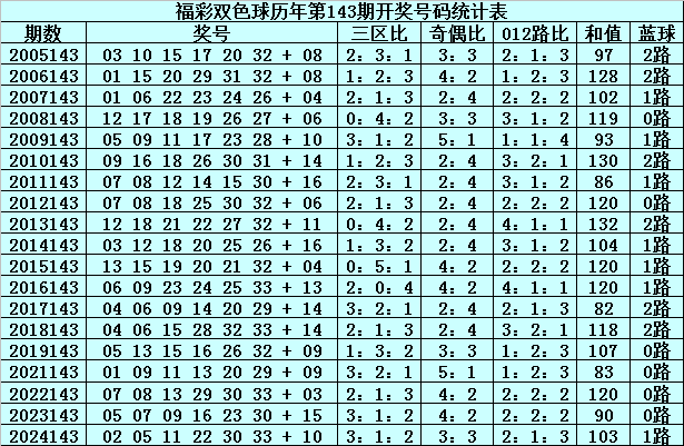 在第143期历史同期奖号中,红球三区分布总比例为33:40:41,奇偶总比例为58:56,012路比为43:29:42,和值分布在82-132之间,蓝球号码012路总比例为6:7:6。