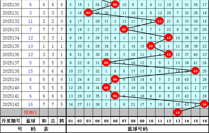 蓝球分析:上期蓝球奖号开出16,为大号,上周四蓝球奖号开出05,最近十周四蓝球号码大小比为6:4,大号蓝球明显较热,本周四注意大号蓝球继续开出,参考蓝球号码09、10、11、12、13。