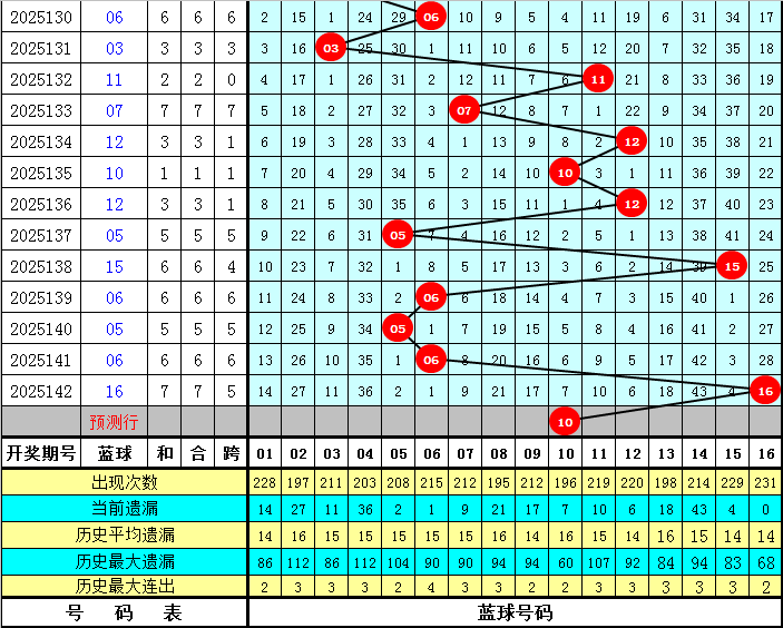 上期开出蓝球号码16,该号码在最近300期中出现了23次,其下期分别开出:蓝球05出现3次,蓝球01、04、08、11、13出现2次,蓝球02、03、06、09、10、12、14、15、16出现1次,蓝球07出现0次。本期五码蓝球参考02、04、05、10、15,独蓝关注10。