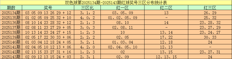 双色球第2025143期奖号为:02 09 12 13 15 24 + 03,红球三区比为2:3:1。