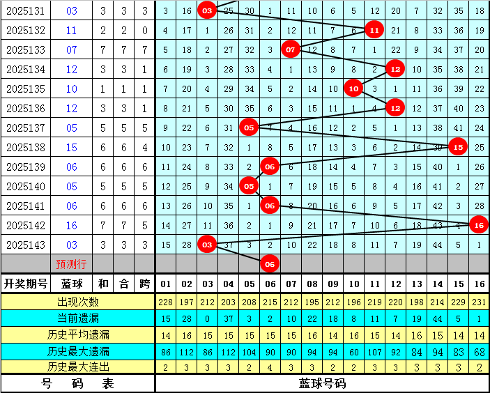 蓝球走势分析:上周日第25141期蓝球开出号码06,最近十周星期日蓝球号码大小比为7:3,奇偶比为4:6,012路比为3:6:1。本期蓝球重点关注偶数号,看好蓝球04、06。