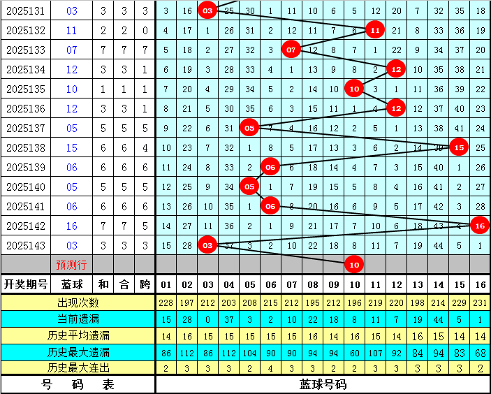 蓝球号码分析:上期蓝球为03,开出0路号码,蓝球最近10期012路比为6:2:2,最近30期012路比为13:11:6,最近100期012路比为31:38:31,本期蓝球看好1路号码,四码蓝球参考01、07、10、13。
