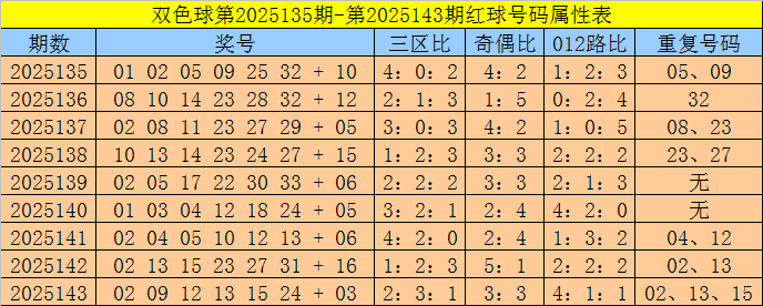 福彩双色球第2025143期奖号为:02 09 12 13 15 24 + 03,红球奇偶比为3:3,三区比为2:3:1,012路比为4:1:1,重号:02、13、15。