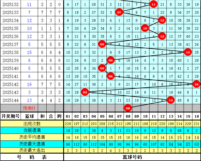 蓝球分析(定义:01-04为一区,05-08为二区,09-12为三区,13-16为四区):上期蓝球开出四区号码13,最近10期蓝球四区落号比为1:4:2:3,总体上一区蓝球较少,二区蓝球表现较热,本期蓝球看好在第二区开出,独蓝参考08。