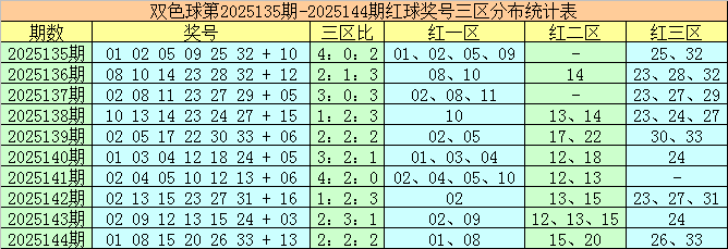 双色球第2025144期开出奖号为:01、08、15、20、26、33+13,其中红球三区比为2:2:2,蓝球开出奇数、大号、1路号码。