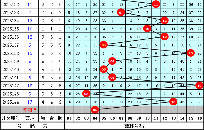 蓝球分析:上期蓝球为大号13,最近10期大小蓝球号码分别出现5次,走势相当,本期看好小 号蓝球,参考蓝球04。
