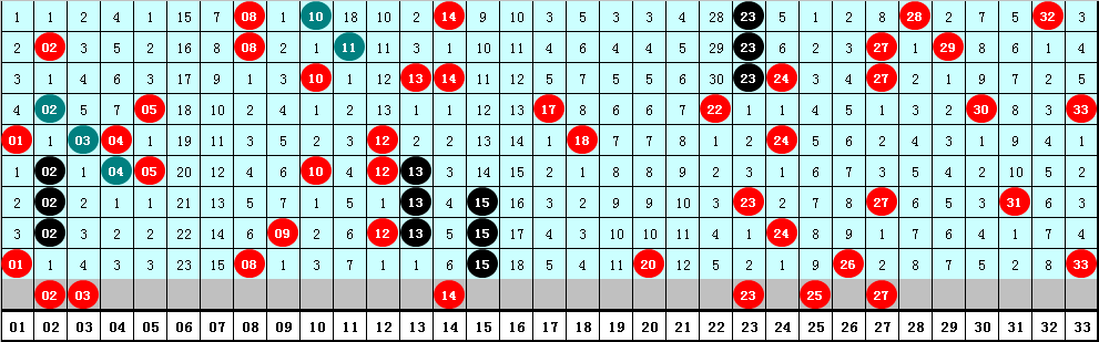 2、凤尾分析:最近十期凤尾号码分布在13-33区间,出现范围较广,凤尾在29两端次数比为5:5,开出次数相当,本期预计凤尾开出在29以内,关注号码27。