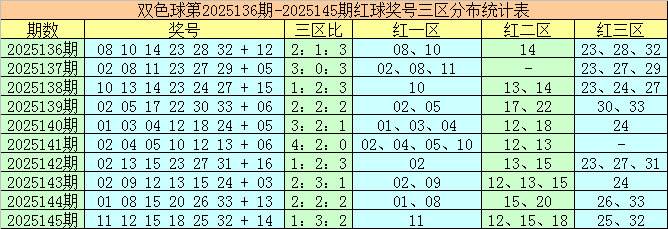 双色球第2025145期开出奖号为:11、12、15、18、25、32+14,其中红球三区比为1:3:2,蓝球开出偶数、大号、2路号码。