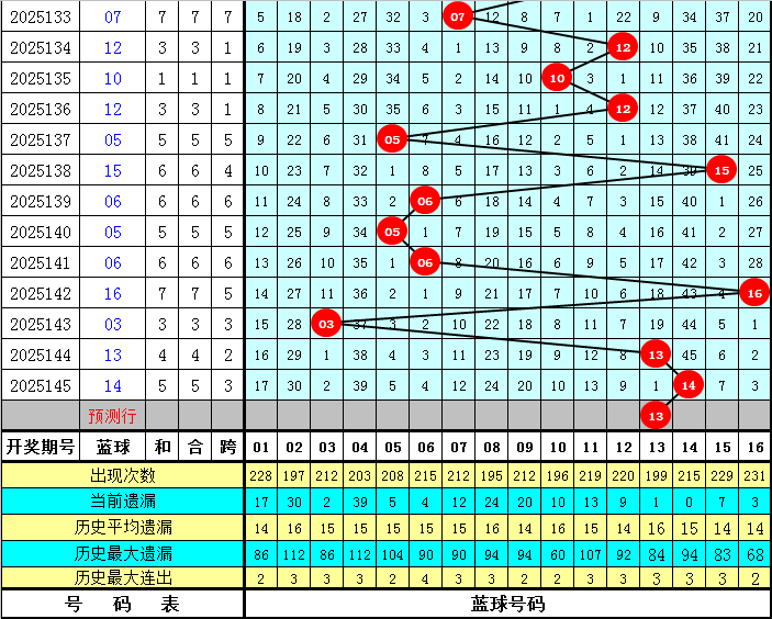 蓝球号码分析:上期蓝球为14,开出2路号码,蓝球最近10期012路比为5:2:3,最近30期012路比为13:11:6,最近100期012路比为31:38:31,本期蓝球看好1路号码,四码蓝球参考04、07、10、13。