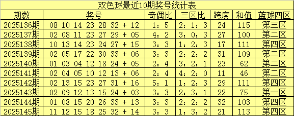 南华天第2025146期双色球区间号码个数统计分析:(红球:01-11为一区,12-22为二区,23-33为三区;蓝球:01-04为一区,05-08为二区,09-12为三区,13-16为四区)