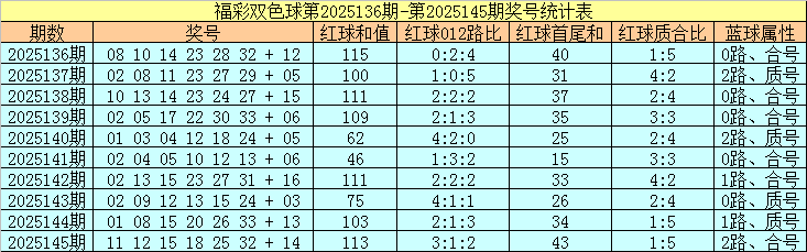 福彩双色球第2025145期红球奖号为:11、12、15、18、25、32,蓝球奖号为:14,其中红球和值为113,012路比为3:1:2,首尾和为43,质合比为1:5,蓝球属性为2路、合号。