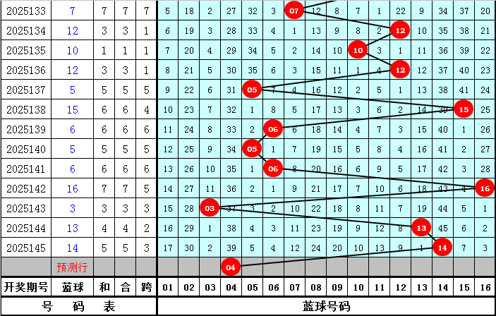 蓝球号码分析:最近30期蓝球号码质合比为15:15,最近10期蓝球质合比为4:6,最近5期蓝球分别为:06、16、03、13、14,本期蓝球关注合数号码,参考蓝球号码04。