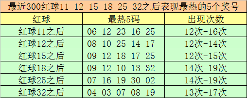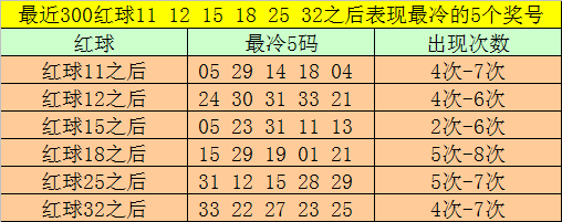 红球冷码统计:双色球第2025145期开出红球奖号分别为:11、12、15、18、25、32,在最近300期开奖中,各号码出现之后其下期出现最少的5个红球分别为:
