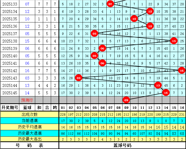 上期开出蓝球号码14,该号码在最近300期中出现了18次,其下期分别开出:蓝球05出现3次,蓝球06、16出现2次,蓝球01、02、04、07、08、10、12、13、14、15出现1次,蓝球03、09、11出现0次。本期五码蓝球参考03、04、06、09、14,独蓝关注09。