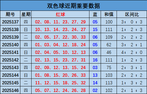 双色球上期开出奖号:05 07 12 24 26 28+02,和值102,区间比2:1:3
