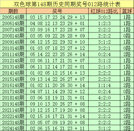 福彩双色球第2025148期历史同期王守礼012路奖号遗漏分析: