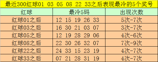 红球冷码统计:双色球第2025147期开出红球奖号分别为:01、03、05、08、22、33,在最近300期开奖中,各号码出现之后其下期出现最少的5个红球分别为: