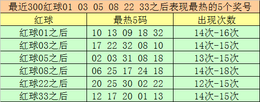 红球03之后最热5码为:17、22、32、08、10;