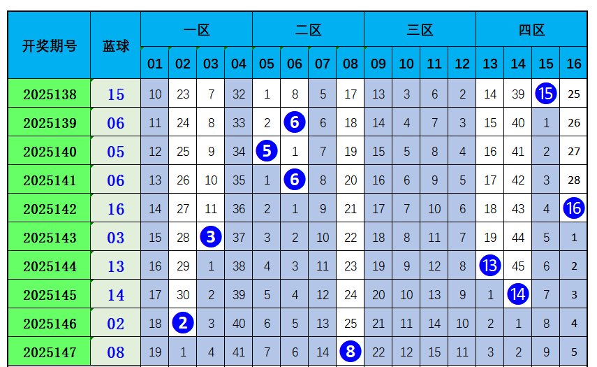 上期开出蓝球号码08,近10期,一区开出2次,二区开出4次,三区开出0次,四区开出4次,总体走势:三区表现较冷,本期看好蓝球号码:01。
