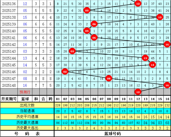 蓝球号码分析:上期蓝球为16,开出1路号码,蓝球最近10期012路比为3:3:4,最近30期012路比为11:11:8,最近100期012路比为30:37:33,本期蓝球看好0路号码,四码蓝球参考03、06、09、12。