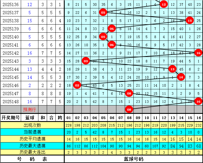 蓝球分析【一区01-04,二区05-08,三区09-12,四区13-16】:上期蓝球为16,出现在第四区,近50期区间比为11:14:12:13,近10期区间比为2:4:0:4,本期预计蓝球出现在第二区,推荐蓝球08。