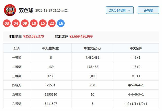双色球第2025148期开奖号码为:03、04、09、10、15、22+16。其中红球三区比为4:2:0,奇偶比为3:3,包含2个重号:03、22,蓝球出现在第四区。