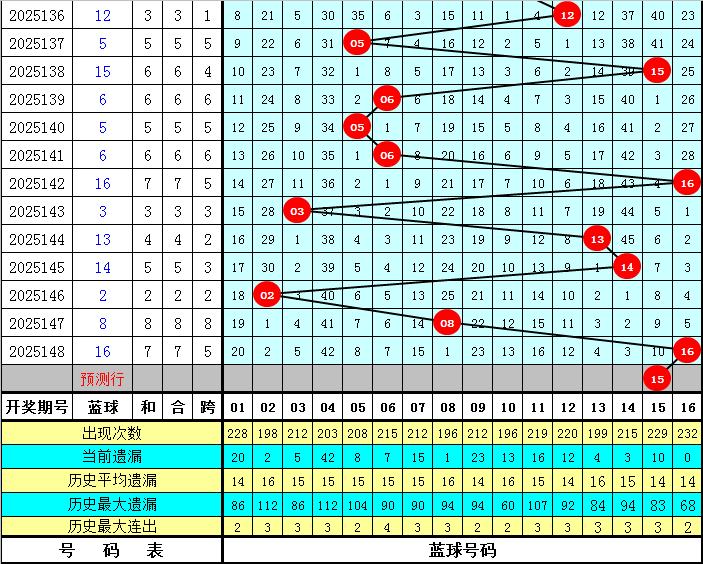 蓝球分析:在第149期历史同期开奖中,蓝球号码奇偶比为14:5,最近5年同期奇偶走势为:奇、奇、偶、奇、偶,今年同期看好开出奇数蓝球,参考号码15。