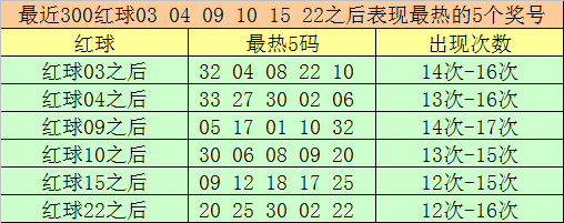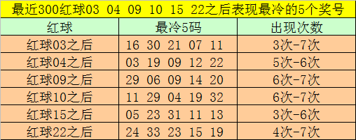 红球冷码统计:双色球第2025148期开出红球奖号分别为:03、04、09、10、15、22,在最近300期开奖中,各号码出现之后其下期出现最少的5个红球分别为: