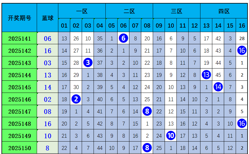 最近10期蓝球号码分别开出06、16、03、13、14、02、08、16、10、08,大小比为5:5,本期预测开出小数蓝球号码:05。