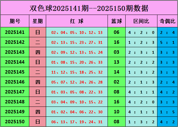 双色球第2025150期开奖:本期开奖号:06 13 17 19 24 31。蓝球:08,奇偶比为4:2。
