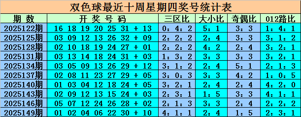 蓝球走势分析:上周四第25149期蓝球开出号码10,最近十周星期四蓝球号码大小比为4:6,奇偶比为7:3,012路比为4:3:3。本期蓝球建议侧重奇数号码,参考蓝球05、09。