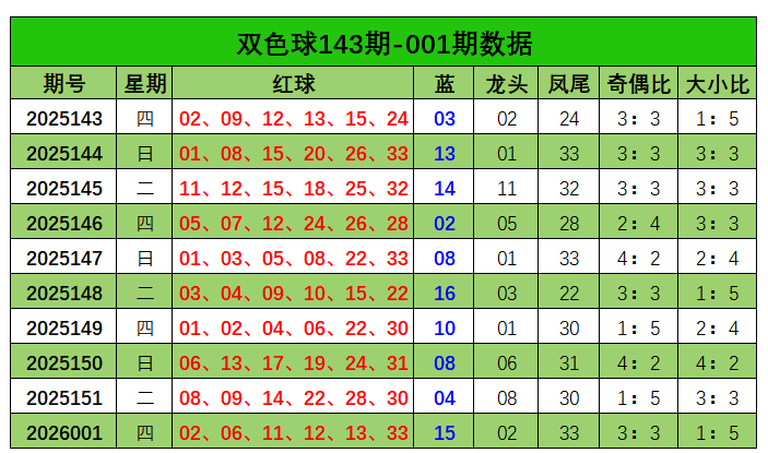 双色球第2026001开奖奖号:红球02、06、11、12、13、33,蓝球15。红球龙头02,凤尾33,奇偶比为3:3,大小比1:5。蓝球开出15。