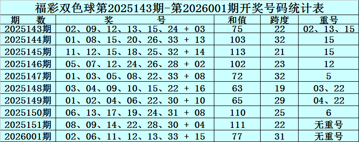 双色球第2026001期奖号开出:02、06、11、12、13、33 + 15,红球号码和值开出77,跨度开出31,开出重号0个:无重号。蓝球为0路号码。