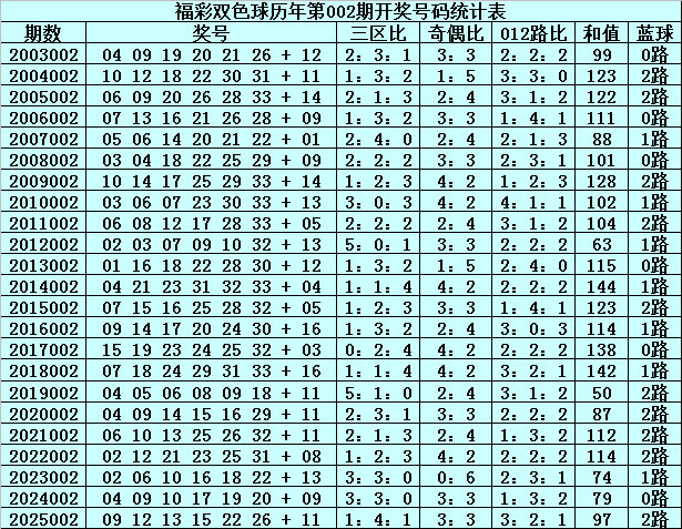 在第002期历史同期奖号中,红球三区分布总比例为43:49:46,奇偶总比例为62:76,012路比为50:50:38,和值分布在50-144之间,蓝球号码012路总比例为6:7:10。