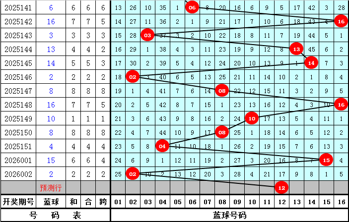 蓝球5码推荐:02、04、08、12、14