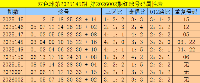 福彩双色球第2026002期奖号为:01 05 07 18 30 32 + 02,红球奇偶比为3:3,三区比为3:1:2,012路比为2:2:2,重号:无。