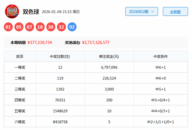 双色球第2026002期开奖,红球:01、05、07、18、30、32;蓝球:02。其中红球012路比为2:2:2,奇偶比为3:3,和值为93,跨度为31,蓝球开出2路号码。