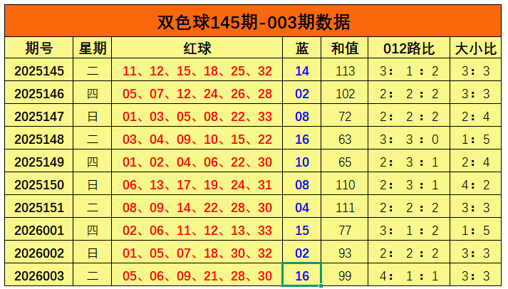 双色球第2026003开奖奖号:红球05、06、09、21、28、30,蓝球16。红球和值99,012路比4:1:1,大小比3:3。蓝球开出大数号码16。