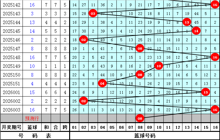 蓝球前10期开出号码为:14→02→08→16→10→08→04→15→02→16。